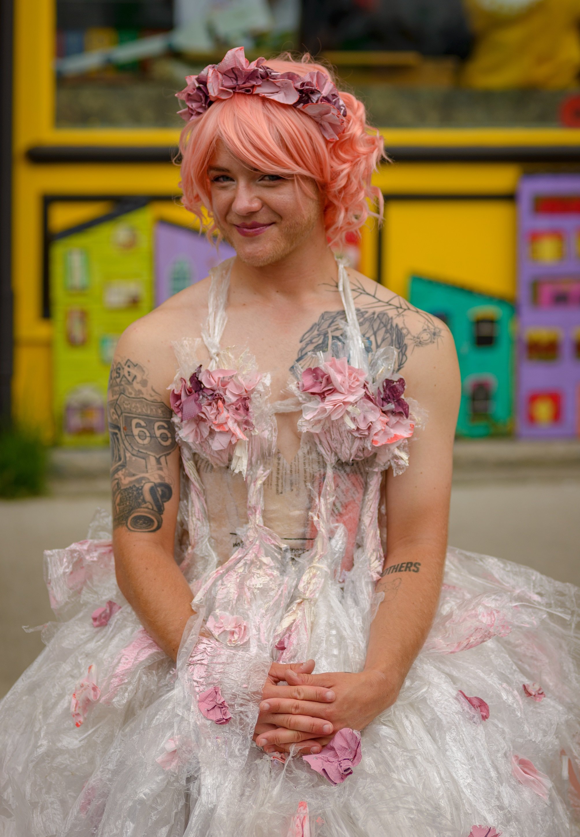 “Mother Nature” is a living sculpture, crafted from garbage and embodied by drag; a ball-gown made entirely from plastic packaging pilfered from a warehouse and latex paint. The only new material is the glue binding everything together. It was a tongue-in-cheek comment on fast – fashion, laboriously constructing a garment out of that which ships mass-produced apparel across the seas. I consciously modelled the gown after a fairy-tale princess - delicate, modest, and adorned with a cascade of pink flowers – using the juxtaposition of teasing beauty out of trash to inspire discomfort and reflection.